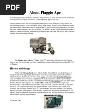 The ape has been marketed in various configurations, including as vans and pickups for load carrying (popular with postal administration in some countries) and as an autorickshaw ().more recently piaggio has offered models such as the ape cross country and the ape web aimed at the youth market... 125 zoekresultaten van piaggio ape.